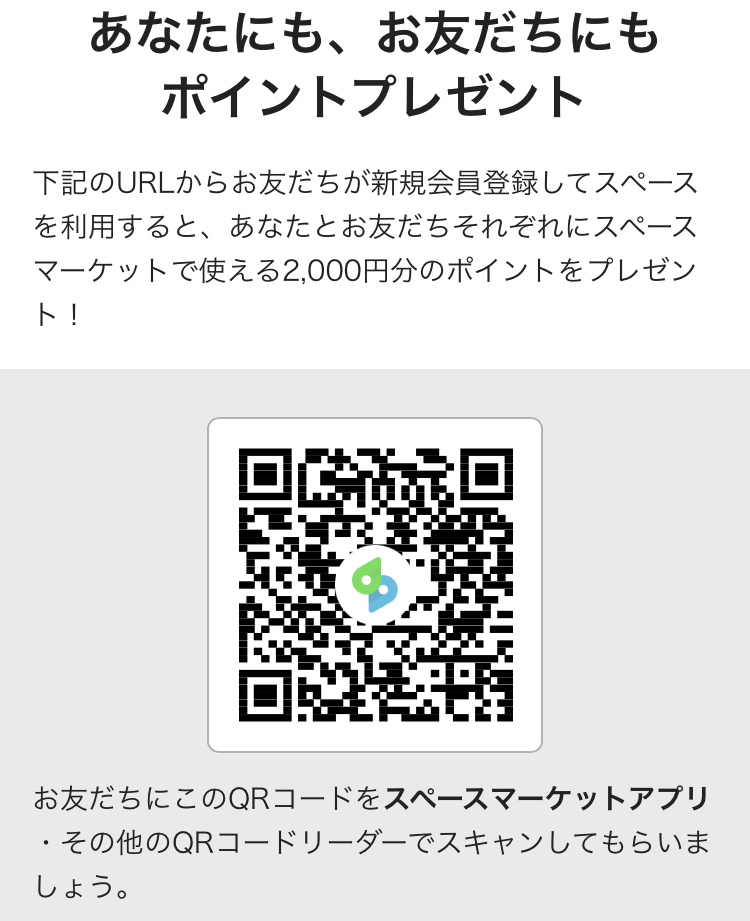 ちなみに、次のコードから会員登録をして部屋を利用すると、わたしと登録者のあなた両方にレンタルスペース利用で使える2,000ポイントが付与されますのでお得です。