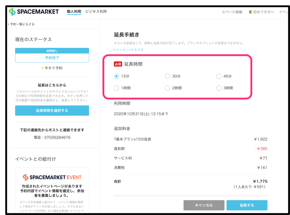 - 延長する場合は利用30分前、終了30分前に通知が来るのでそこから申請