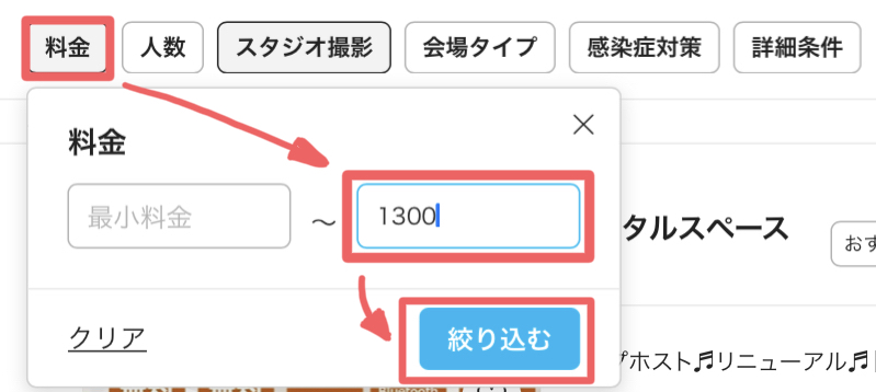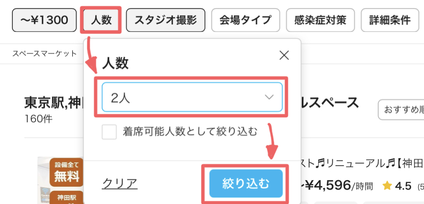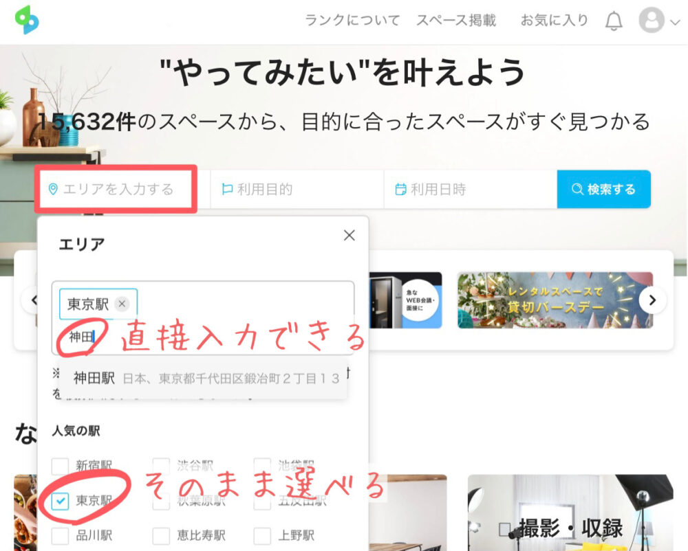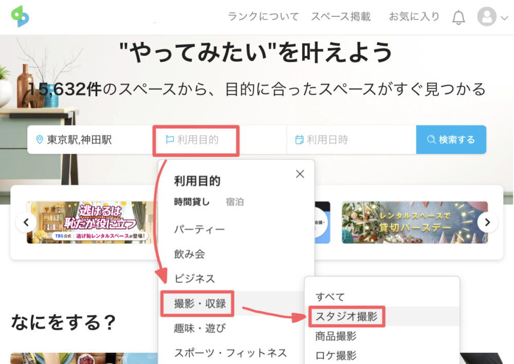 スペースマーケットのサイトでは場所や人数、用途別に応じた検索がしやすい構成になっています。今回の撮影場所は以下の手順で見つけました。