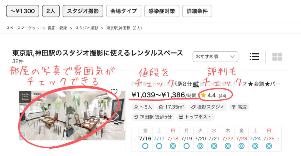 今回は撮影をする目的で下記のレンタルスペースを借りることにしました。